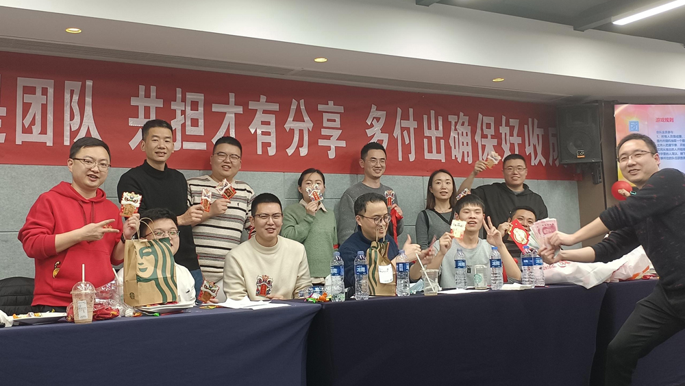 會議由劉總主持,董事長王總全程參加。年會議題包括全員述職、部門總結、優秀員工頒獎、團建游戲和會餐活動。會議中伴隨著多次抽獎,大小紅包不斷,迎來陣陣喝彩。會休和聚餐過程中都有熱鬧的游戲和熱切的互動,成為今年年會的一大特色。